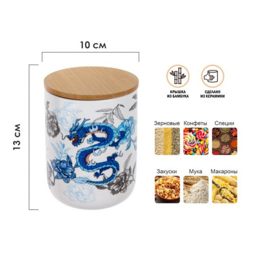 Банка украшена принтом дракона - символом плодородия, жизни, света, силы, мудрости, что делает ее отличным подарком для любителей азиатской культуры. Керамический материал обеспечивает сохранность вкуса и аромата продуктов, не вступая в химическую реакцию с ними, а также легко моется и сохраняет свою первоначальную внешность на протяжении длительного времени.