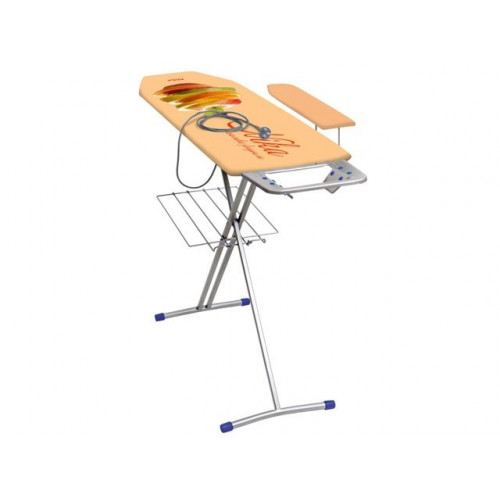 Четырехопорные металлические ножки с пластмассовыми наконечниками сохраняют надежную устойчивость доски и не царапают поверхность пола.Конструкция имеет двухступенчатую регулировку высоты. Чехол сшит из качественной хлопковой ткани, не желтеет и не линяет. В модели также есть съемный подрукавник для удобства глажения рукавов и дополнительная полка для белья.