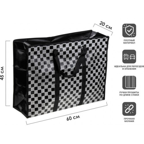 Плотная хозяйственная сумка. Предназначена для транспортировки разных грузов. Такие сумки используются как в логистике, так и в личных целях. Очень удобны для переездов. Сумка имеет укрепленные ручки и застежку-молнию, что сохраняет упаковываемый товар и вещи от грязи и пыли.