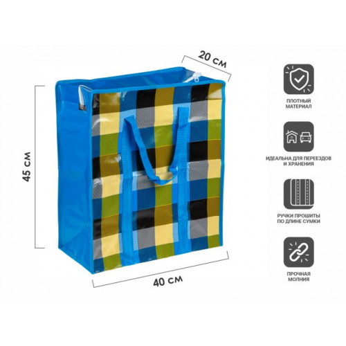 Плотная хозяйственная сумка. Предназначена для транспортировки разных грузов. Такие сумки используются как в логистике, так и в личных целях. Очень удобны для переездов. Сумка имеет укрепленные ручки и застежку-молнию, что сохраняет упаковываемый товар и вещи от грязи и пыли.