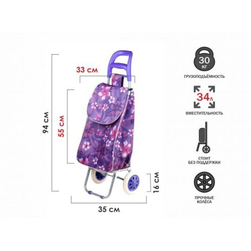 Сумка-тележка хозяйственная на колесах 30 кг, фиолетовая, цветы, PERFECTO LINEA