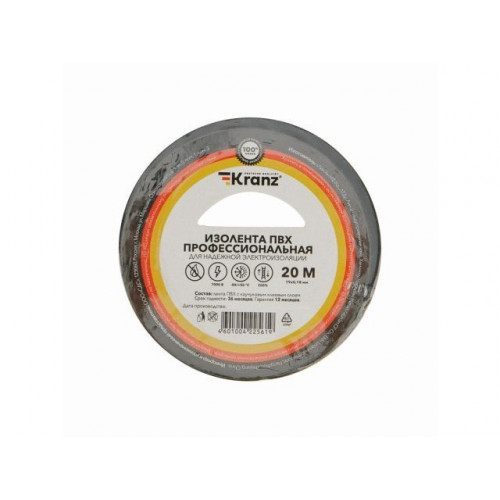Изолента ПВХ 19 мм х 20 м черная, KRANZ профессиональная