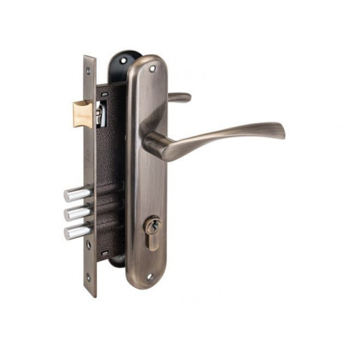 Три стальных ригеля круглого сечения диаметром 12мм, вылет 20мм. Универсальная защелка. Стальной корпус с подшипником, покрыт полимерной краской. Межосевое расстояние 85 мм. Удаление ключевого отверстия 45мм. Материал ручек алюминиевый сплав.