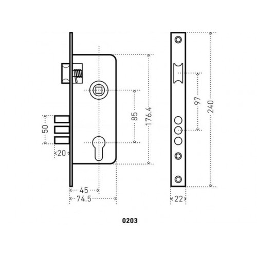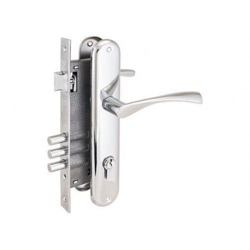 Три стальных ригеля круглого сечения диаметром 12мм, вылет 20мм. Универсальная защелка. Стальной корпус с подшипником, покрыт полимерной краской. Межосевое расстояние 85 мм. Удаление ключевого отверстия 45мм. Материал ручек алюминиевый сплав.