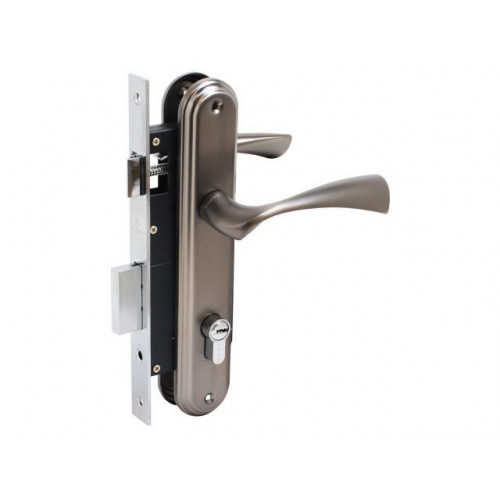 Замок врезной с комплектом ручек на планке. Предназначен для установки в деревянные двери толщиной 35 - 38 мм, правого и левого открывания. Материал ручки - цинковый сплав ЦАМ. Материал планки - сталь. Покрытие комплекта ручек: гальваническое, многослойное.
