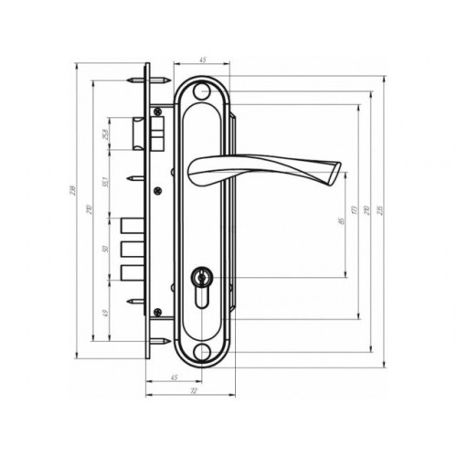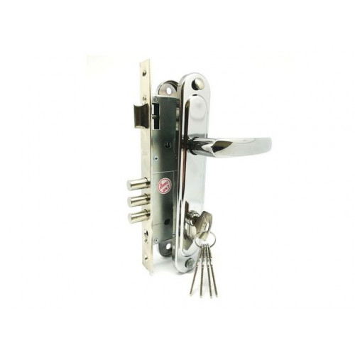 Гальваническое покрытие. Межосевое расстояние 85 мм, Удаление ключевого отверстия 45 мм. По посадочным размерам совпадает с замками Апекс 22 серии, Аллюр, Фуаро и другими замками китайского производства с межосевым расстоянием 85 мм.