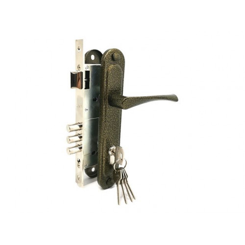 Гальваническое покрытие. Межосевое расстояние 85 мм, Удаление ключевого отверстия 45 мм. По посадочным размерам совпадает с замками Апекс 22 серии, Аллюр, Фуаро и другими замками китайского производства с межосевым расстоянием 85 мм.