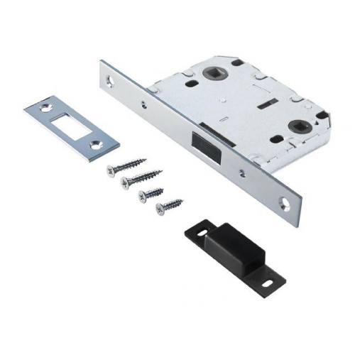 Универсальная защёлка врезная для установки на деревянные межкомнатные двери. Материал - сталь, гальваническое покрытие.Под ручку с квадратом 8 мм и сантехническую завертку с квадратом 6 мм. Удаление ключевого отверстия - 50 мм. Межосевое расстояние - 70 мм. Прямоугольная торцевая планка. Ширина планки - 18мм. Габариты корпуса - 96х71х12 мм. В комплекте - защелка, саморезы, ответная планка и пластиковый вкладыш к ней.