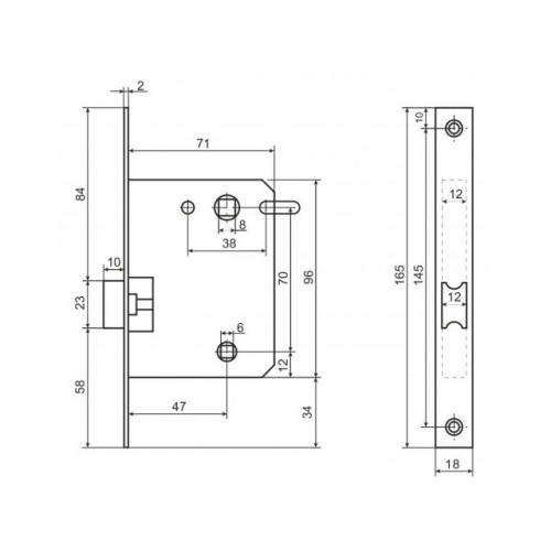 Универсальная защёлка врезная для установки на деревянные межкомнатные двери. Материал - сталь, гальваническое покрытие.Под ручку с квадратом 8 мм и сантехническую завертку с квадратом 6 мм. Удаление ключевого отверстия - 47 мм. Межосевое расстояние - 70 мм. Прямоугольная торцевая планка. Ширина планки - 18мм. Габариты корпуса - 96х71х12 мм. В комплекте - защелка, саморезы, ответная планка и белый пластиковый вкладыш к ней.