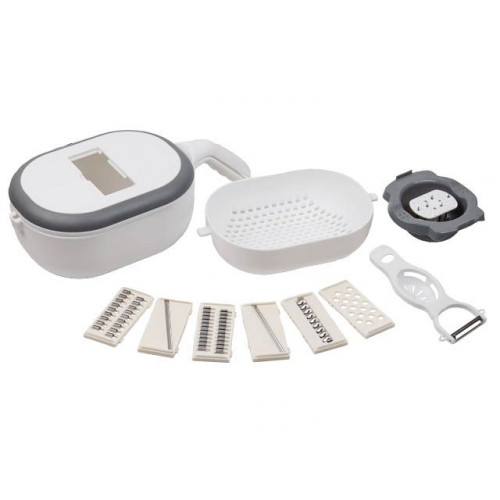 Многофункциональная овощерезка, изготовленная из высокопрочного пластика, имеет большое количество насадок с лезвиями из нержавеющей стали.