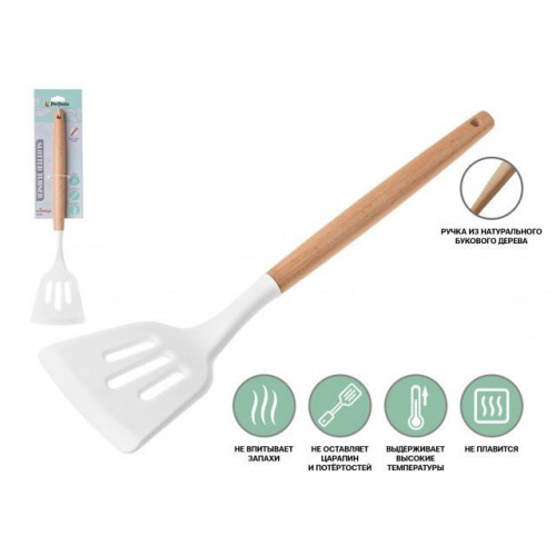 Лопатка выполнена из материала, который выдерживает высокие температурные нагрузки и полностью безопасна для здоровья человека. Не повреждает антипригарное покрытие кастрюль и сковородок.