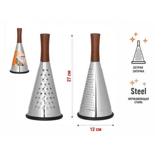 Конусная тёрка для овощей, фруктов и сыра - это настоящее открытие для любителей кулинарии. Этот удобный и практичный инструмент станет незаменимым помощником на кухне. Терка имеет деревянную ручку и круглую форму, что делает ее удобной в использовании. Она легко помещается в руке и не скользит во время работы.