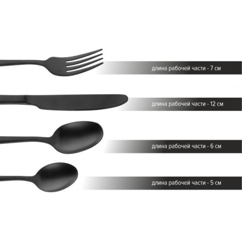 В наборе: 6 столовых ножей, 6 столовых ложек, 6 вилок, 6 чайных ложек.