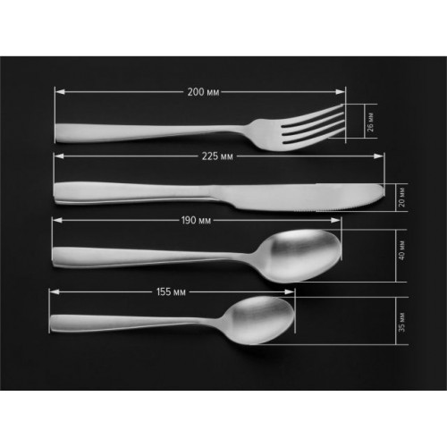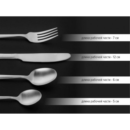 В наборе: 6 столовых ножей, 6 столовых ложек, 6 вилок, 6 чайных ложек.