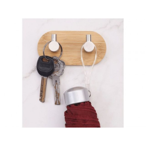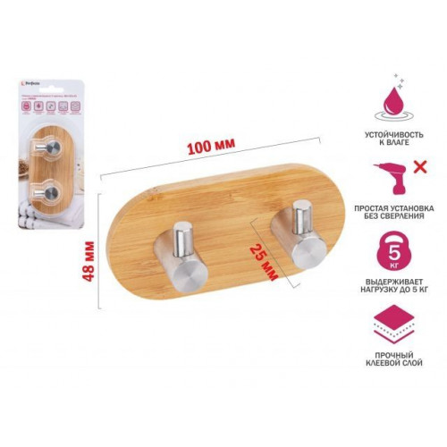 Планка самоклеящаяся 2 крючка VIRGO, нержавеющая сталь/бамбук, блистер, PERFECTO LINEA