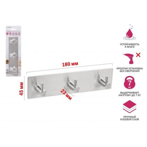 Планка самоклеящаяся 3 крючка PEGASUS, нержавеющая сталь, блистер, PERFECTO LINEA
