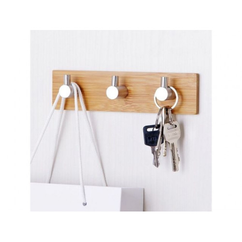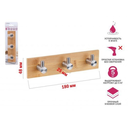 Планка самоклеящаяся 3 крючка PEGASUS, нержавеющая сталь/бамбук, блистер, PERFECTO LINEA