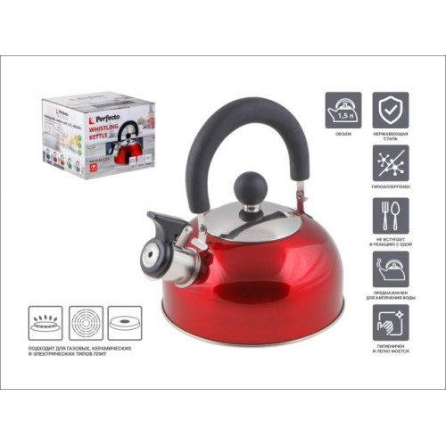 Чайник со свистком, нержавеющая сталь, 1.5 л, серия Holiday, красный металлик, PERFECTO LINEA