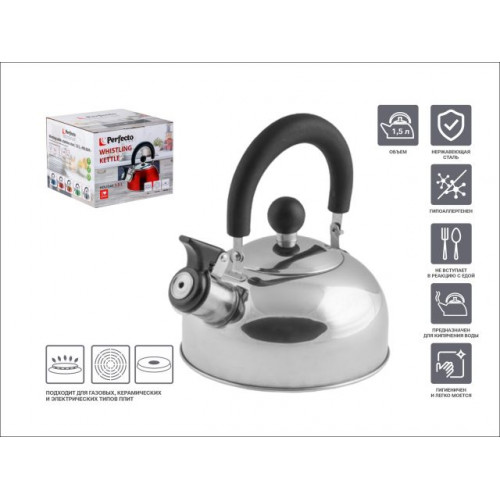 Чайник со свистком, нержавеющая сталь, 1.5 л, серия Holiday, серебристый металлик, PERFECTO LINEA