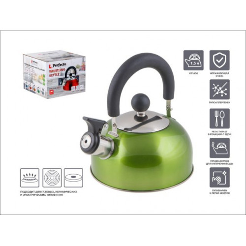 Чайник со свистком, нержавеющая сталь, 1.5 л, серия Holiday, зеленый металлик, PERFECTO LINEA