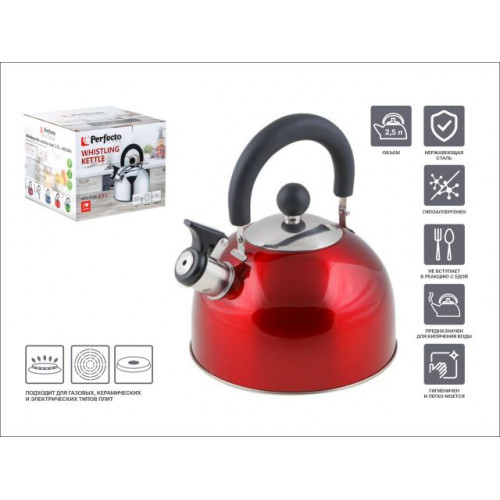 Чайник со свистком, нержавеющая сталь, 2.5 л, серия Holiday, красный металлик, PERFECTO LINEA