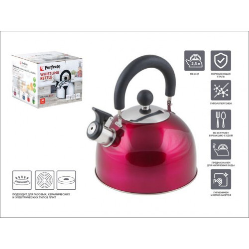 Чайник со свистком, нержавеющая сталь, 2.5 л, серия Holiday, вишневый металлик, PERFECTO LINEA