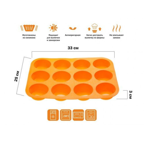 Форма для выпечки, силиконовая, прямоугольная на 12 кексов, 33 х 25 х 3 см, оранж., PERFECTO LINEA