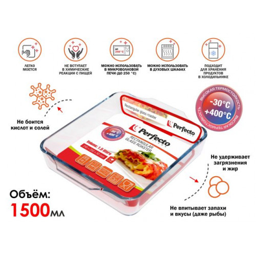 Форма из жаропрочного стекла, 1.5 л, прямоугольная, 240х200х50 мм, PERFECTO LINEA