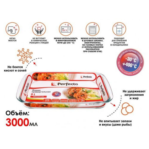 Форма из жаропрочного стекла, 3.0 л, прямоугольная, 394x237x50 мм, PERFECTO LINEA