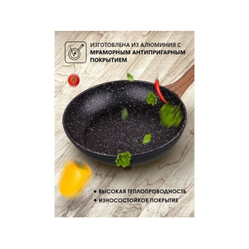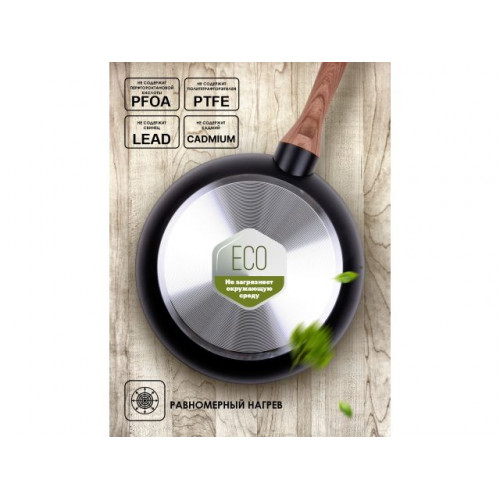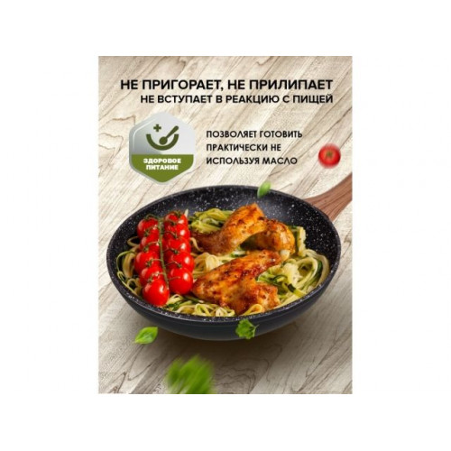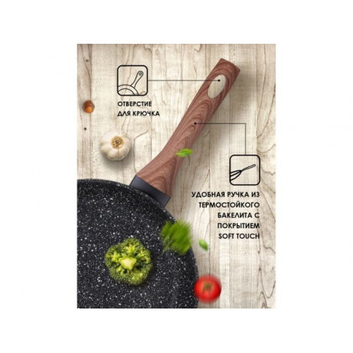 Бакелитовая ручка сковороды, с покрытием Soft touch, не нагревается при использовании, что делает процесс приготовления еды еще приятнее. Экологически чистый и безопасный для здоровья продукт. Легко моется. Еда не пригорает к сковороде.