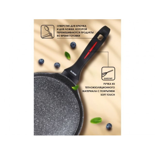 Изготовлена по высокоточным технологиям из алюминия. Обладает высокой прочностью, легкостью и практичностью. Мраморное антипригарное покрытие нового поколения позволяет готовить практически без использования масла, что значительно увеличивает полезность приготавливаемых блюд. Бакелитовая ручка сковороды, с покрытием Soft touch, не нагревается при использовании, что делает процесс приготовления еды еще приятнее.