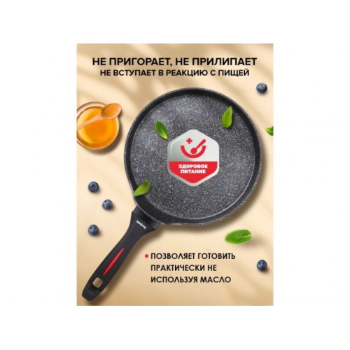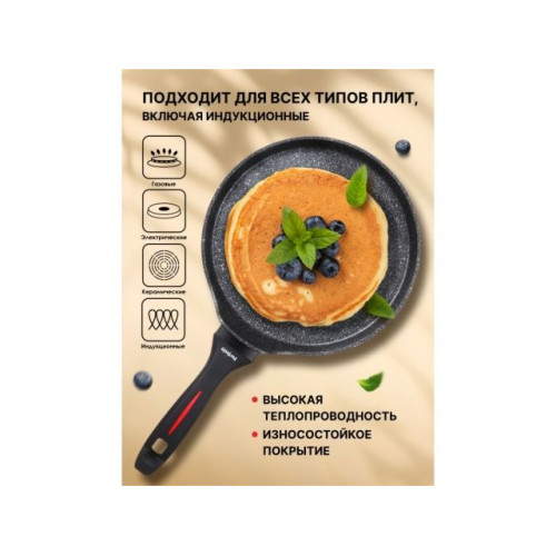 Сковорода специально предназначена для приготовления вкусных и ровных блинчиков. Антипригарное покрытие обеспечивают легкое переворачивание блинов и равномерное обжаривание, создавая идеальную золотистую корочку!