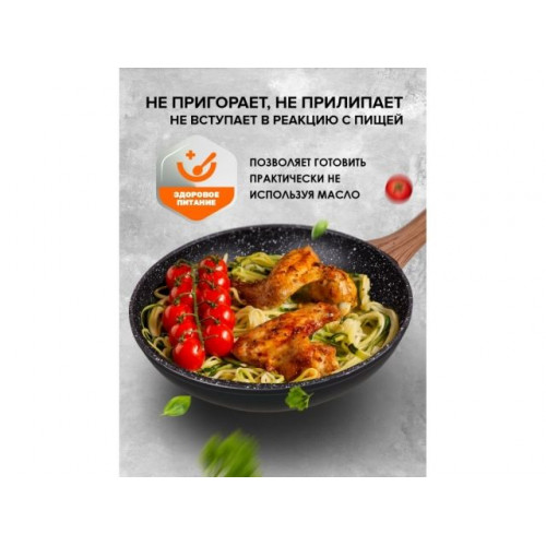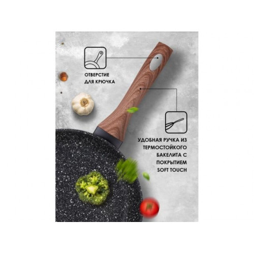 Бакелитовая ручка сковороды, с покрытием Soft touch, не нагревается при использовании, что делает процесс приготовления еды еще приятнее.