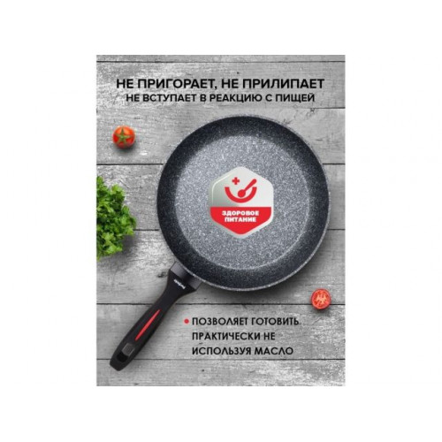 Изготовлена по высокоточным технологиям из алюминия. Обладает высокой прочностью, легкостью и практичностью. Мраморное антипригарное покрытие нового поколения позволяет готовить практически без использования масла, что значительно увеличивает полезность приготавливаемых блюд.