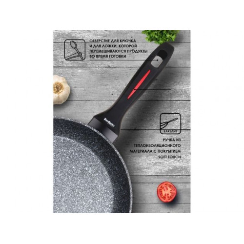 Бакелитовая ручка сковороды, с покрытием Soft touch, не нагревается при использовании, что делает процесс приготовления еды еще приятнее.