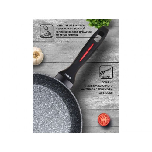 Бакелитовая ручка сковороды, с покрытием Soft touch, не нагревается при использовании, что делает процесс приготовления еды еще приятнее.