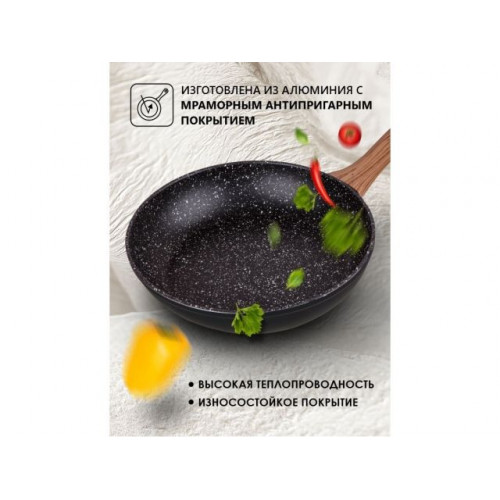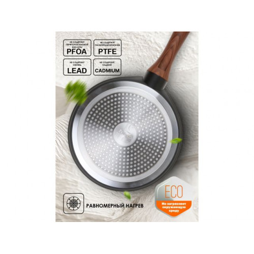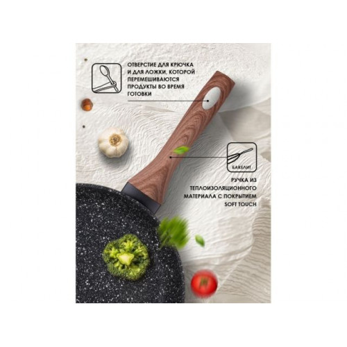 Бакелитовая ручка сковороды, с покрытием Soft touch, не нагревается при использовании, что делает процесс приготовления еды еще приятнее. Экологически чистый и безопасный для здоровья продукт. Легко моется. Еда не пригорает к сковороде.