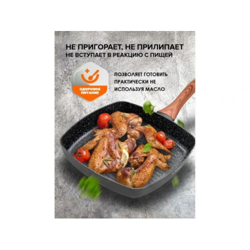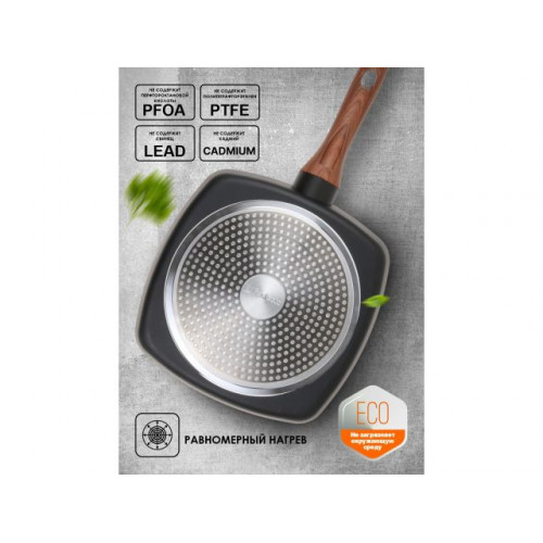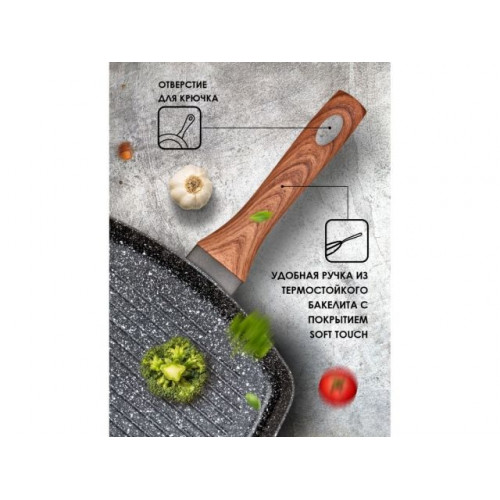 Бакелитовая ручка сковороды, с покрытием Soft touch, не нагревается при использовании, что делает процесс приготовления еды еще приятнее. Экологически чистый и безопасный для здоровья продукт. Легко моется. Еда не пригорает к сковороде.