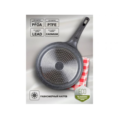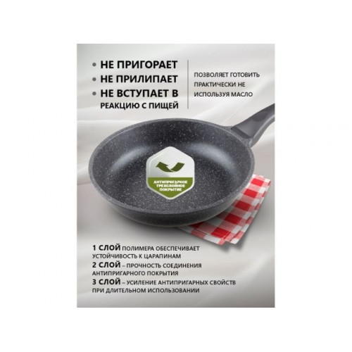 Имеет антипригарное трехслойное мраморное покрытие: один слой полимера обеспечивает устойчивость к царапинам, второй - прочность соединения антипригарного покрытия, третий - усиление антипригарных свойств при длительном использовании. Покрытие не вступает в реакцию с пищей, а потому абсолютно безвредно для человека- даже при попадании частичек в пищеварительный тракт.