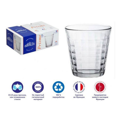 Коллекция Prisme - проявление моды во всех ее гранях. Практичные, эстетичные, прочные и эргономичные стаканы культового бренда ТМ Duralex . Стеклянная посуда ТМ Duralex производится во Франции с 1945 года. Процесс закаливания придает стеклу ТМ Duralex особую прочность. Во время закаливания стекло ТМ Duralex предварительно нагретое до 700°С, подвергается резкому охлаждению холодным воздухом. Этот процесс делает стекло ТМ Duralex в 2,5 раза более устойчивым к механическим повреждениям, чем отожженное стекло. Характеристики: ударопрочное закаленное стекло, термостойкость до 130 ° C (EN 1183), можно мыть в посудомоечной машине, подходит для использования в микроволновой печи.