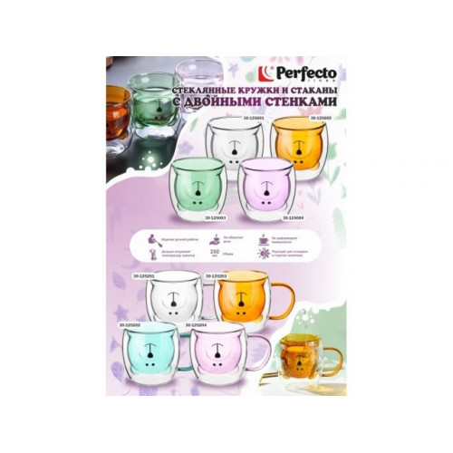 Кружка стеклянная ТМ PERFECTO LINEA серии Bear с двойными стенками выполнена из термостойкого боросиликатного стекла, которое выдерживает температуру от -20C до 280C. Ее можно использовать для горячих и холодных напитков. Корпус кружки благодаря особому составу стекла обладает уникальными характеристиками. Он тонкий, легкий и прочный одновременно. Прослойка воздуха между стенками сохраняет температуру напитков дольше обычного. Внешняя стенка кружки при этом остается холодной, даже если внутри кипяток. Если вы нальете в кружку ледяной напиток, то на внешней стенке не образуется конденсат. Напиток останется холодным, а стенка нейтральной, что удобно в летнее время. Поверхность устойчива к царапинам, она не помутнеет со временем даже при частом мытье в посудомоечной машине.