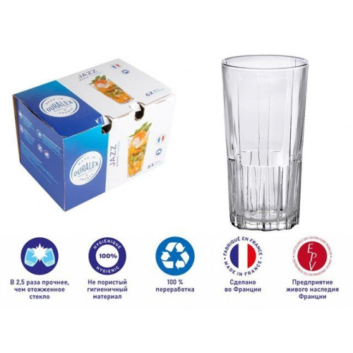 Коллекция Jazz отличается универсальным , легким и привлекательным дизайном. Практичные, эстетичные, прочные и эргономичные стаканы культового бренда ТМ Duralex Стеклянная посуда ТМ Duralex производится во Франции с 1945 года. Процесс закаливания придает стеклу ТМ Duralex особую прочность. Во время закаливания стекло ТМ Duralex предварительно нагретое до 700°С, подвергается резкому охлаждению холодным воздухом. Этот процесс делает стекло ТМ Duralex в 2,5 раза более устойчивым к механическим повреждениям, чем отожженное стекло. Характеристики: ударопрочное закаленное стекло, термостойкость до 130 ° C (EN 1183), можно мыть в посудомоечной машине, подходит для использования в микроволновой печи.