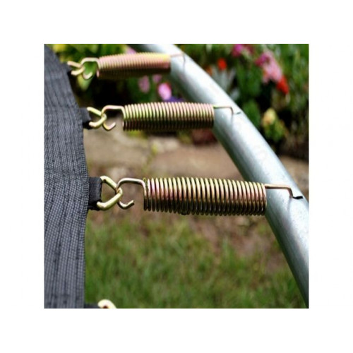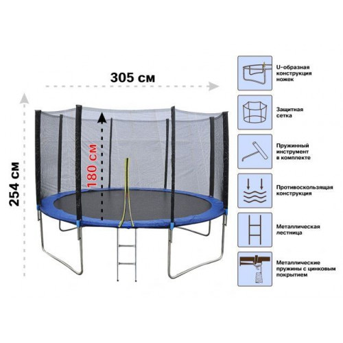 Батут предназначен для прыжков на открытом воздухе. Представляет собой прочную плетёную сетку из полипропилена (прыжковое полотно), натянутую на каркас из гальванизированного металла с защитной сеткой (из полиэтилена) при помощи металлических пружин с цинковым покрытием. Пружины закрыты защитным кожухом из ПВХ толщиной 20 мм. Батут с полным комплектом защиты и с лестницей, позволит безопасно забираться и слезать с батута. Безопасность прыгуна обеспечивается защитной сеткой, которая полностью окружает мат и не позволяет выпрыгнуть из батута при выполнении упражнений, а также мягким кожухом из ПВХ, который полностью закрывает пружины и твердый каркас, тем самым исключает возможность травм. Сделанный из качественных материалов, батут со временем не портится и не выгорает на солнце. Пружины не теряют своей эластичности, а полотно не протирается от интенсивного использования.