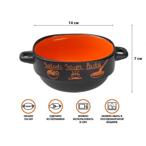 Супница керамическая, 140 мм, круглая, серия Харчо, черно-оранжевая, PERFECTO LINEA