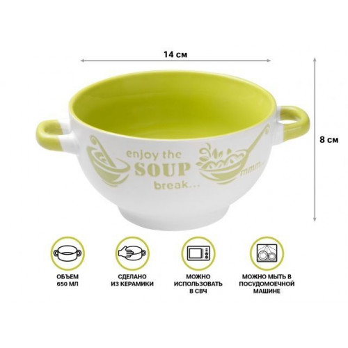 Керамическая супница является стильныи предметом сервировки и предназначен для подачи первых блюд.Для удобства предусмотрены ручки по бокам емкости.