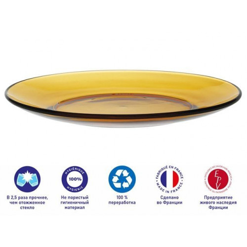 Благодаря актуальному и не подвластному времени дизайну серия ТМ Duralex Lys привнесет нотку элегантности в сервировку стола. Стеклянные тарелки понравятся гостям и подчеркнут Ваши лучшие блюда. Благородный янтарный цвет стекла добавит изюминку и оригинальность сервировке. Ударопрочное стекло обеспечивает привлекательный внешний вид и устойчиво к появлению царапин. Стеклянная посуда ТМ Duralex производится во Франции с 1945 года. Процесс закаливания придает стеклу ТМ Duralex особую прочность. Во время закаливания стекло ТМ Duralex , предварительно нагретое до 700°С, подвергается резкому охлаждению холодным воздухом. Этот процесс делает стекло ТМ Duralex в 2,5 раза более устойчивым к механическим повреждениям, чем отожженное стекло. Характеристики: ударопрочное закаленное стекло, термостойкость до 130 ° C (EN 1183), можно мыть в посудомоечной машине, подходит для использования в микроволновой печи.