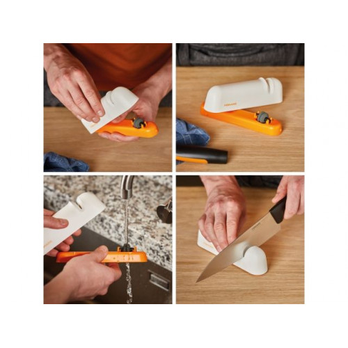 Простая в использовании точилка с керамическим камнем и удобным основанием подходит для правшей и левшей. Сохраняет