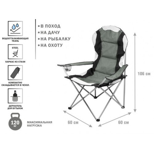 Кресло складное кемпинговое с держателем для бутылок + чехол, серое, ARIZONE