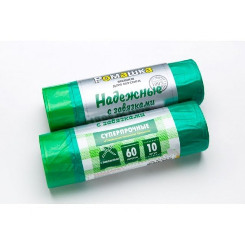 Мешки для мусора с завязками, 60 л, 10 шт, "НАДЕЖНЫЕ", зеленые, РОМАШКА