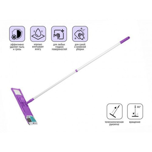 Швабра с практичной ножной педалью. Способна вращаться 360* для удобного использования. Предназначена для сухой и влажной уборки гладких поверхностей (пола, стен, потолков). Идеально подходит для мытья линолеума, паркета, ламината, кафеля. Более гигиенично собирает и удерживает пыль, грязь,жидкость.